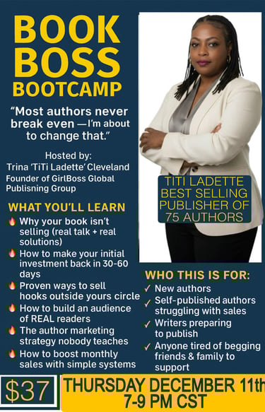 Most authors never break even on their first publishing investment. Book Boss Boot Camp is designed to change that. This workshop will show you how to take your book beyond the bookshelf, build your audience with confidence, and create a real strategy to sell your next 100 books in 60 days.
